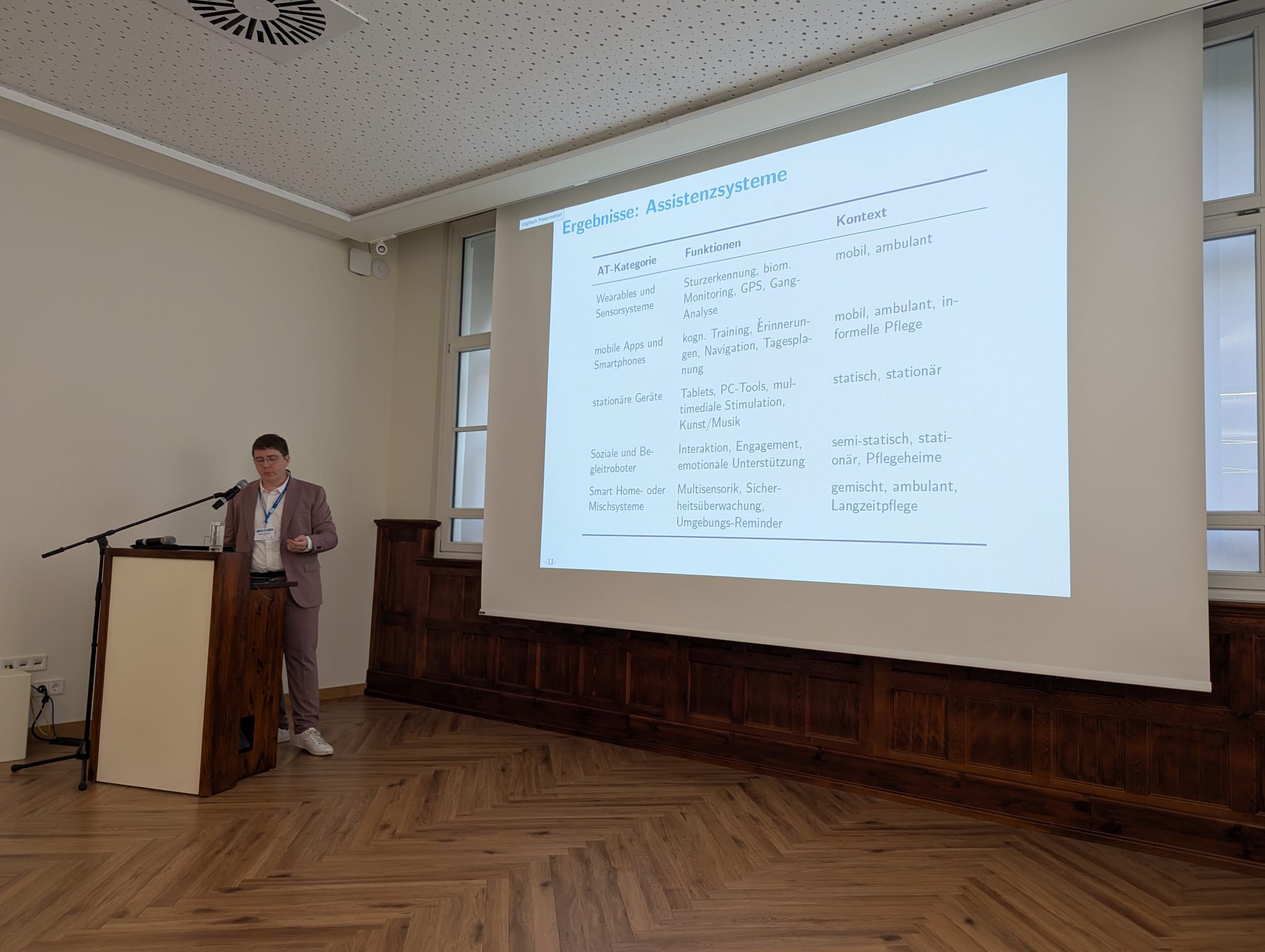 Robin Grashof konnte dabei mit einem Posterbeitrag im Projekt gesammelte Anforderungen an pro-adaptive kognitive Assistenzsysteme aus Perspektive von Menschen mit Alzheimer-Demenz vorstellen. Zudem hielt er einen spannenden Vortrag, in dem er über die Review-Ergebnisse zu kognitiven Assistenzsysteme für degenerative Erkrankungen und zusammenhängende Evaluationsmethoden berichtete.